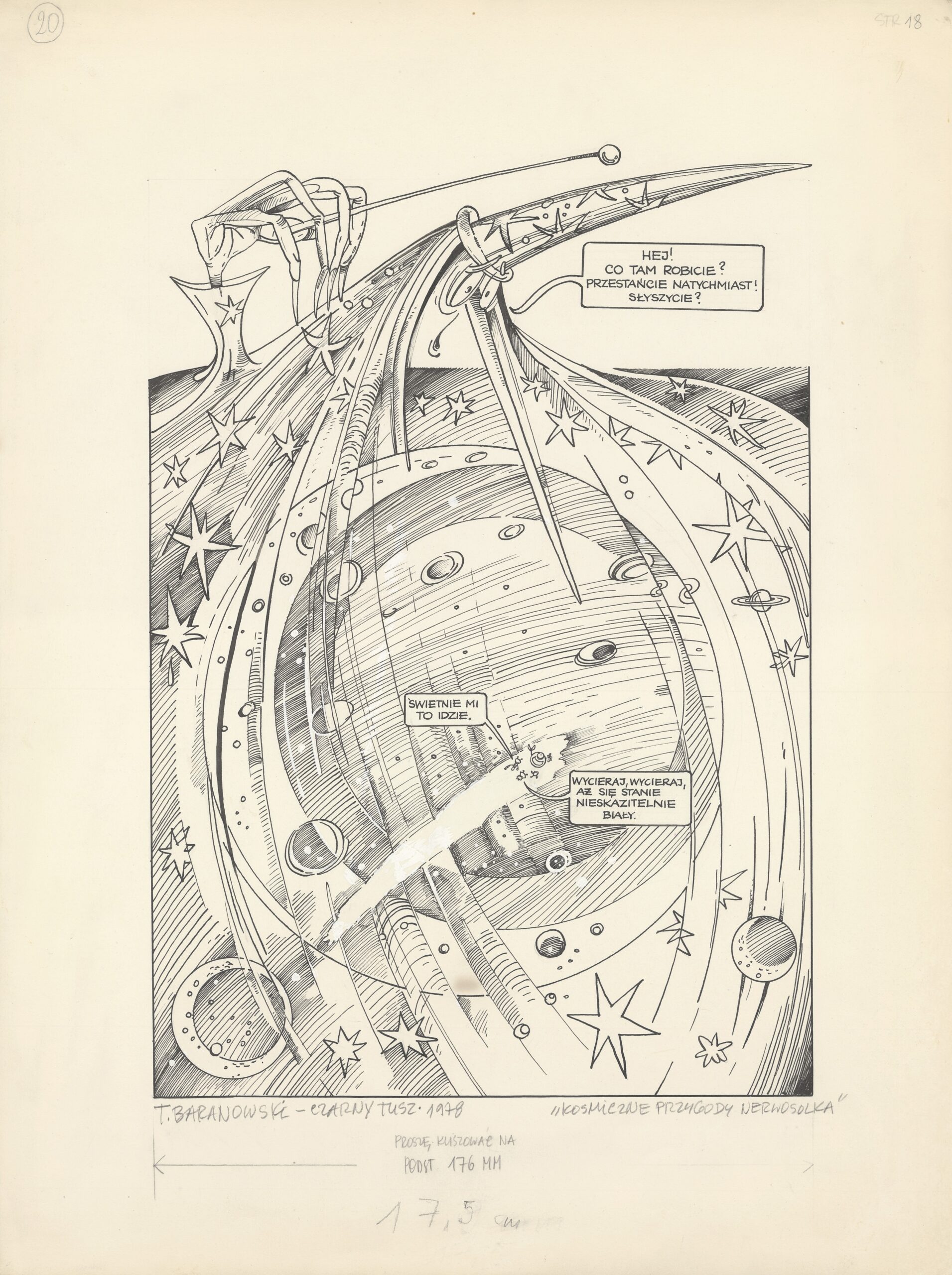 Plansza typu splash (jeden z najbardziej wartościowych i poszukiwanych przez kolekcjonerów rodzajów prac). Wzorcowy wręcz przykład otwartego kadru. Poza tym klasyczna plansza z tego okresu twórczości Baranowskiego, kiedy autor przełamywał tradycyjny w polskim komiksie kanon wielokadrowej strony, zastępując ją trzema, dwoma a nawet pojedynczym kadrem.