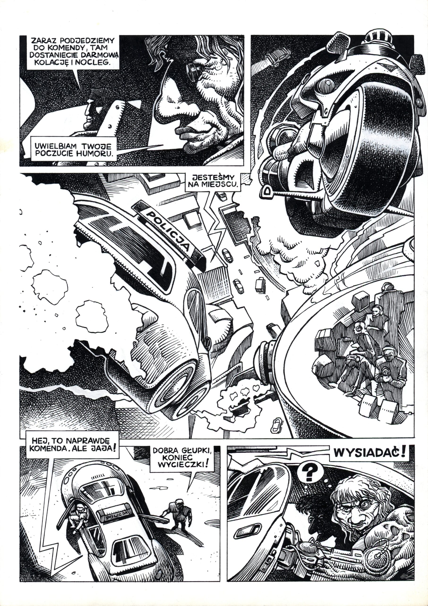 Na planszy widzimy klasyczne dla autora ekspresyjnie ukazane futurystyczne pojazdy, z których to Michalski zasłynął już na przełomie lat 80 i 90. XX w. (cała gama takich wehikułów narysowana była m.in. w komiksie „Zagadka Metropolii”).