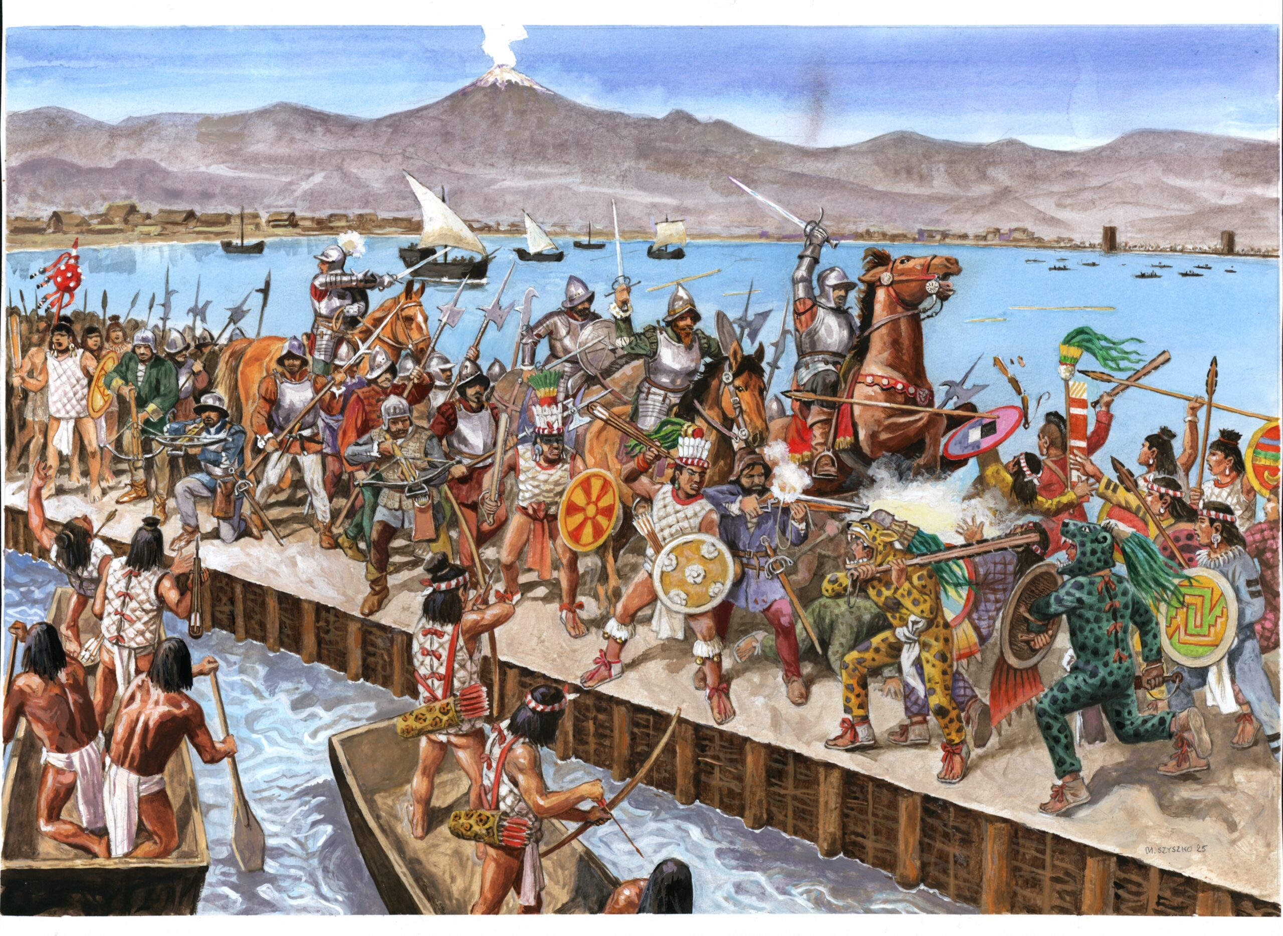 Marek Szyszko, klasyk polskiego komiksu, jeden z popularniejszych twórców, zajmuje się obecnie (z sukcesami) ilustracją historyczną. Perfekcja detalu, efekty kolorystyczne i wyczucie przestrzeni stawia go w rzędzie najlepszych polskich ilustratorów książek historycznych. Tu widzimy przykład jego twórczości, scenę z bitwy Hiszpanów z Aztekami na grobli w Tenochtitlán, w 1521 r. Hiszpanie podbili miasto – stolicę Azteków, co było początkiem końca indiańskiej cywilizacji. Tenochtitlán zrównano z ziemią, zakładając na gruzach miasto Meksyk. Szyszko precyzyjnie oddał rodzaje i szczegóły uzbrojenia obu walczących stron.