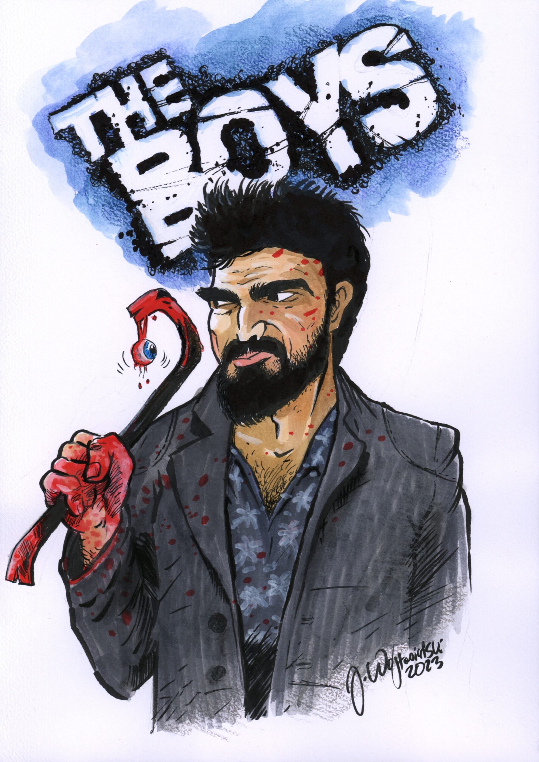 Zaprezentowana tu karykatura Karla Urbana jako Billy Butcher w serialu „The Boys” jest klasyczną karykaturą, czyli tym, co Jaro uprawia od lat, stając si e jednym z najbardziej rozpoznawalnych satyryków wśród rysowników. Wojtasiński nie tylko tworzy karykatury, ale także prowadzi warsztaty dla fanów tego medium w każdym wieku.