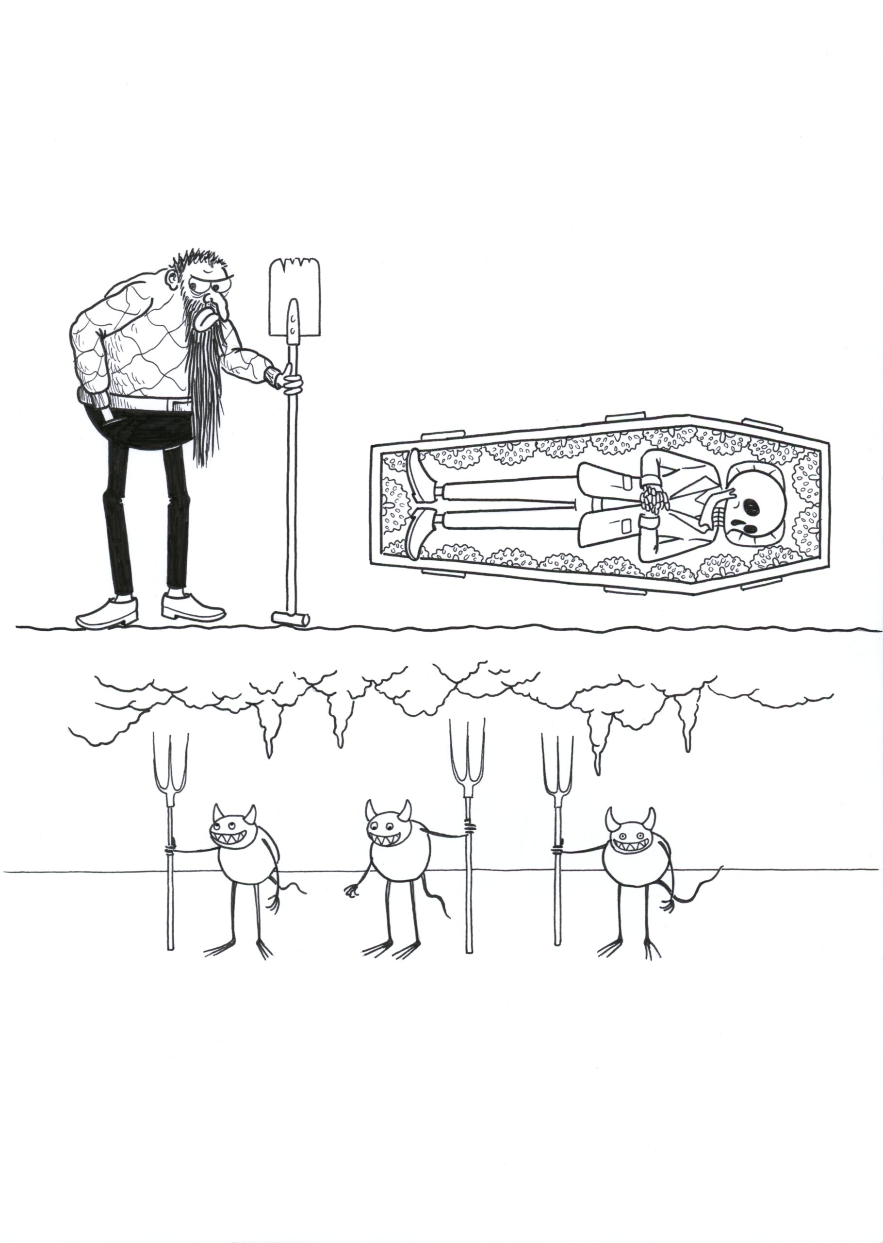 Temat skarpetek, choć może niekoniecznie związany akurat z postacią komiksowego Grabarza, chodził za autorem od dzieciństwa, kiedy to na lekcji religii usłyszał jak ksiądz skarżył się na swój ciężki los, gdyż musiał samemu sobie prac skarpetki… Pomysł wykonania skarpetek z głównym bohaterem wymyślonym lata później przez Śmiechosława, spełnił się dzięki firmie GEEK SOCKS, producentowi skarpetek, dla których artysta zaprojektował wzór z postaciami ze swoich komiksów. Plansze, które wystawiamy są kompletem projektów służącym do wyprodukowania gotowych par skarpetek. Mamy tu precyzyjnie wykonane portrety głównych postaci ora scena grafie piekła oraz – jak to w komiksach o Grabarzu przystało – nieboszczyka w trumnie.