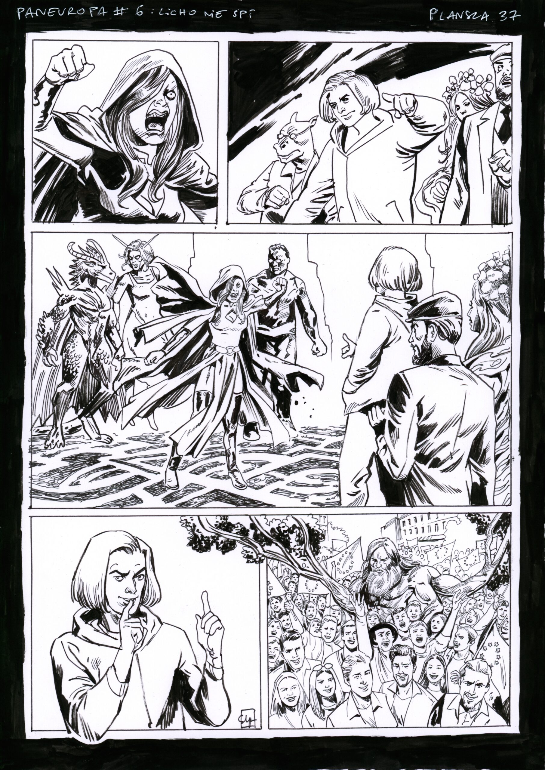 Strona 37 albumu „Licho nie śpi” (część 6 serii „Paneuropa”). Zeszyt opublikowany przez Komisję Europejską Przedstawicielstwo w Polsce (2024). Scenariusz: Dominik Szcześniak.