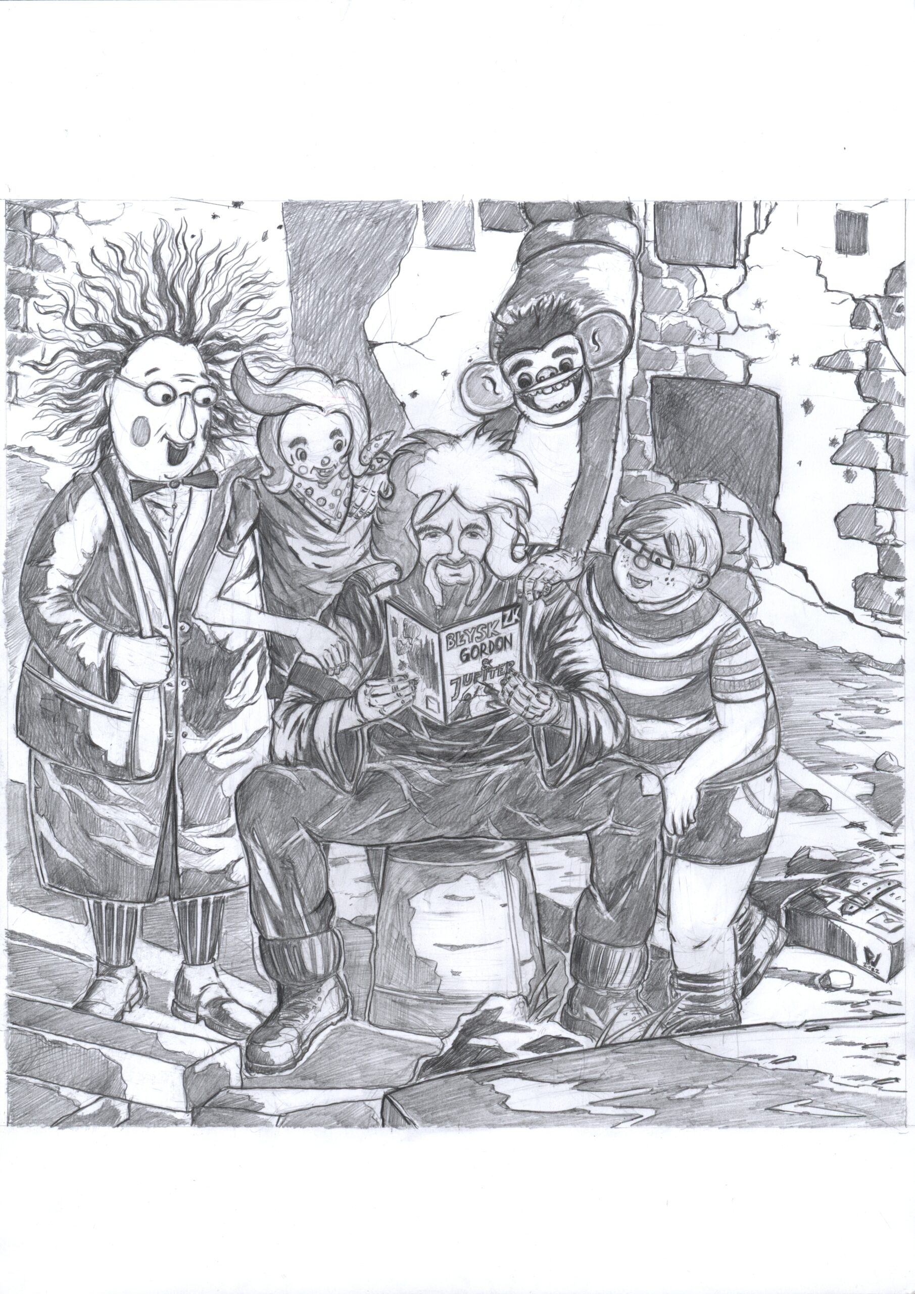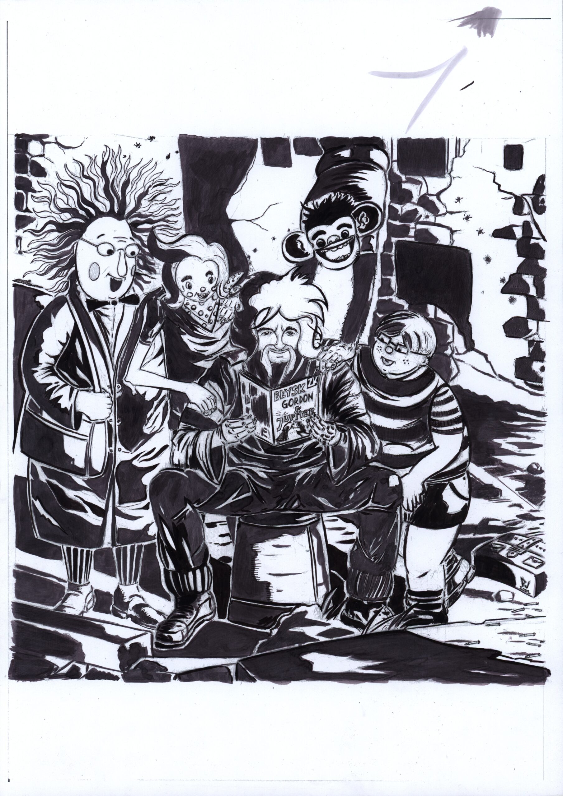Ilustracja przedstawia najsłynniejszą trójkę bohaterów komiksu polskiego wraz z nich duchowym ojcem, czyli Papciem Chmielem. Towarzyscy im profesor Talent z Instytutu Wszechzbytków. Praca składa się z dwóch plansz – w ołówku i w tuszu.
