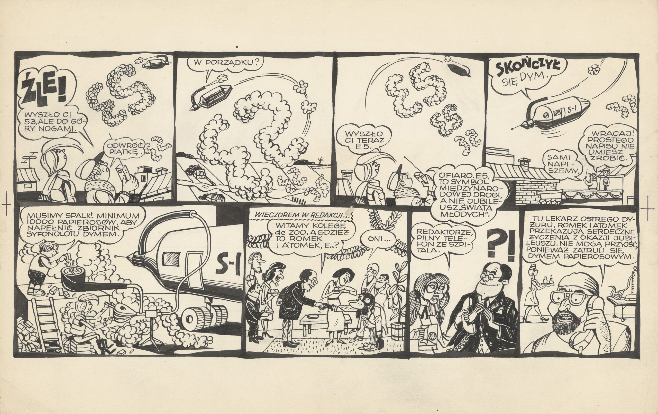 Absolutna klasyka polskiego komiksu. Historyjka „Tytusa, Romka i A’Tomka” bardzo wyjątkowa, bo związana ze specjalnym numerem (komiksowym) „Świata Młodych” na jego 35-lecie. Komiks oryginalnie miał być czarno-biały, a redakcja nałożyła tylko na całość zieloną aplę. Na planszy widzimy pojazd chłopców, co stanowi dodatkowy atut tej pracy. Pojazdy to kanoniczne obiekty w komiksach Papcia Chmiela. Tu mamy jeden z bardziej rozpoznawalnych wehikułów, mianowicie syfonolot z księgi XVI. Rysując ten specjalny odcinek, Papcio był już w trakcie tworzenia księgi XVII, o czym świadczą m.in. charakterystyczne stroje Romka i A’Tomka, w których właśnie tam będą występować.