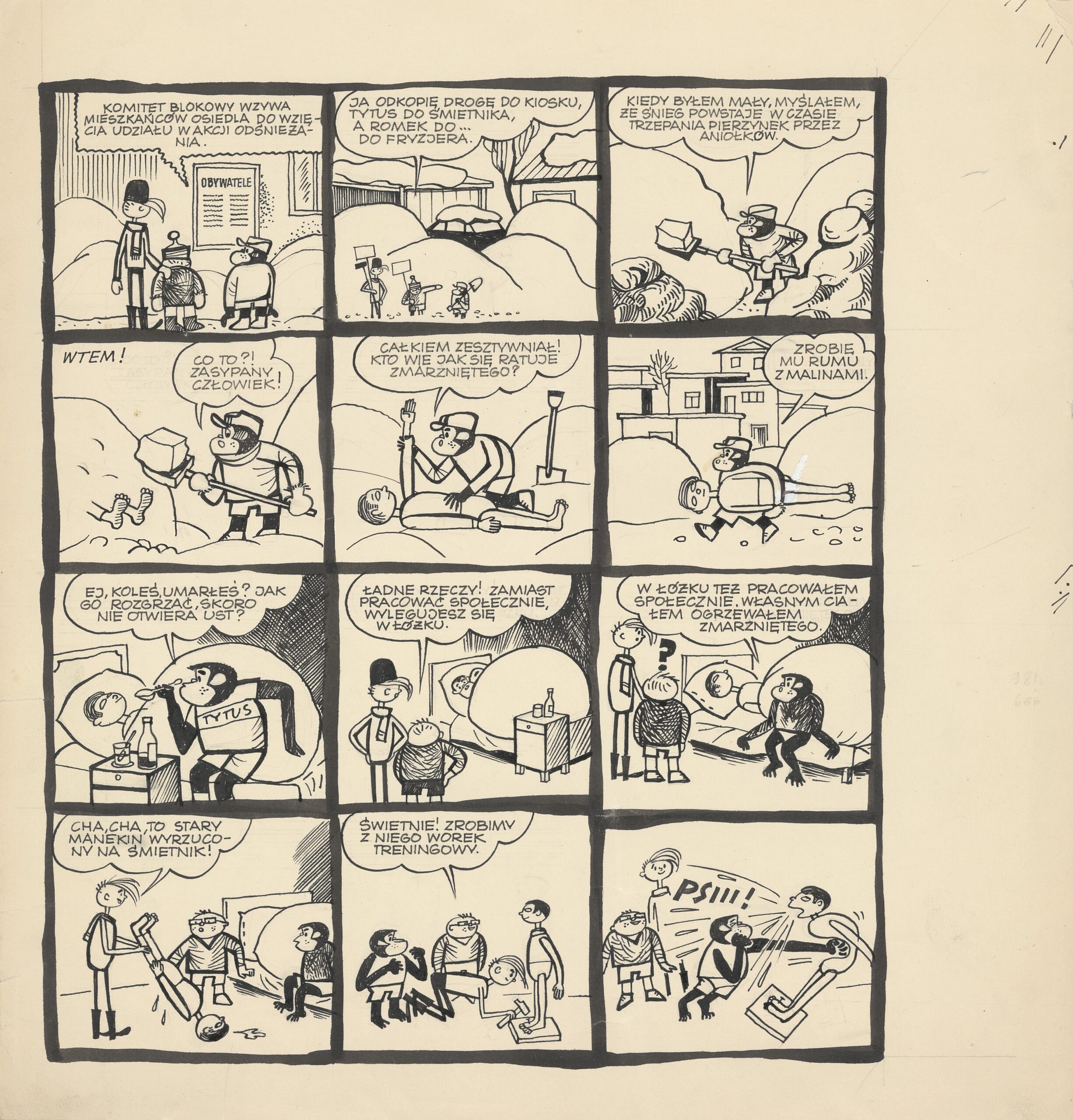 Absolutna klasyka polskiego komiksu. Historyjka „Tytusa, Romka i A’Tomka” przedksiążeczkowa, a więc jedna z bardziej poszukiwanych plansz na kolekcjonerskim rynku. To jedna także z jednostronicówek (zamknięta całość) opublikowanych w zimowych numerach gazety. W tym epizodzie chłopcy na wezwanie komitetu blokowego zajmują się odśnieżaniem.