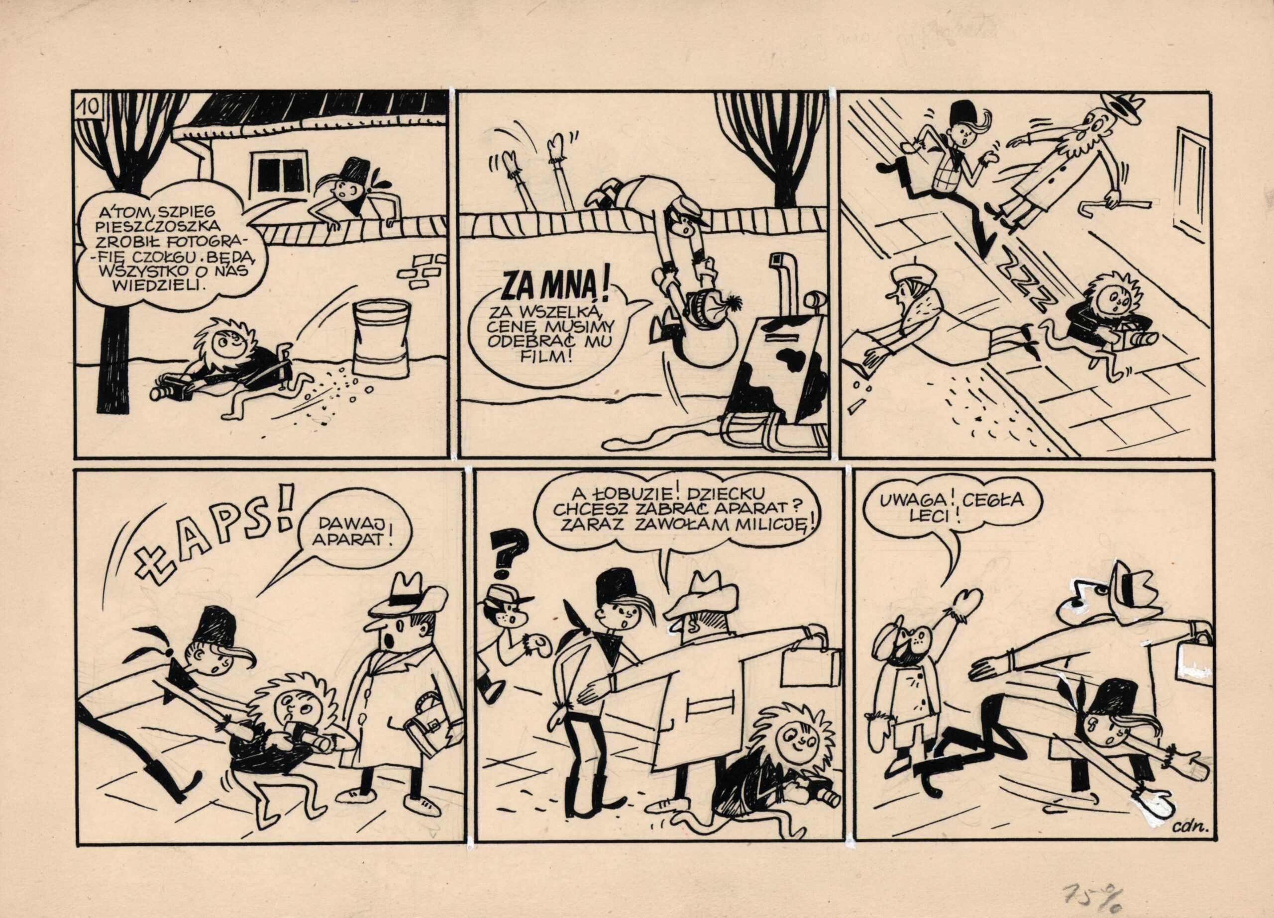 Absolutna klasyka polskiego komiksu. Historyjka „Tytusa, Romka i A’Tomka” przedksiążeczkowa, a więc jedna z bardziej poszukiwanych plansz na kolekcjonerskim rynku. Jest to ponadto pierwsza wersja przygód związanych z zabawą w wojsko, znanych z kilka lat późniejszej księgi IV. Są tu te same gagi i teksty! Na planszy widzimy także pojazd chłopców, co stanowi dodatkowy atut tej pracy. Pojazdy to kanoniczne obiekty w komiksach Papcia Chmiela. Tu mamy „rakietowóz (nabywany też „czołgiem”)”, wyposażony w płozy śnieżne zamiast kół – akcja toczy się bowiem zimą.