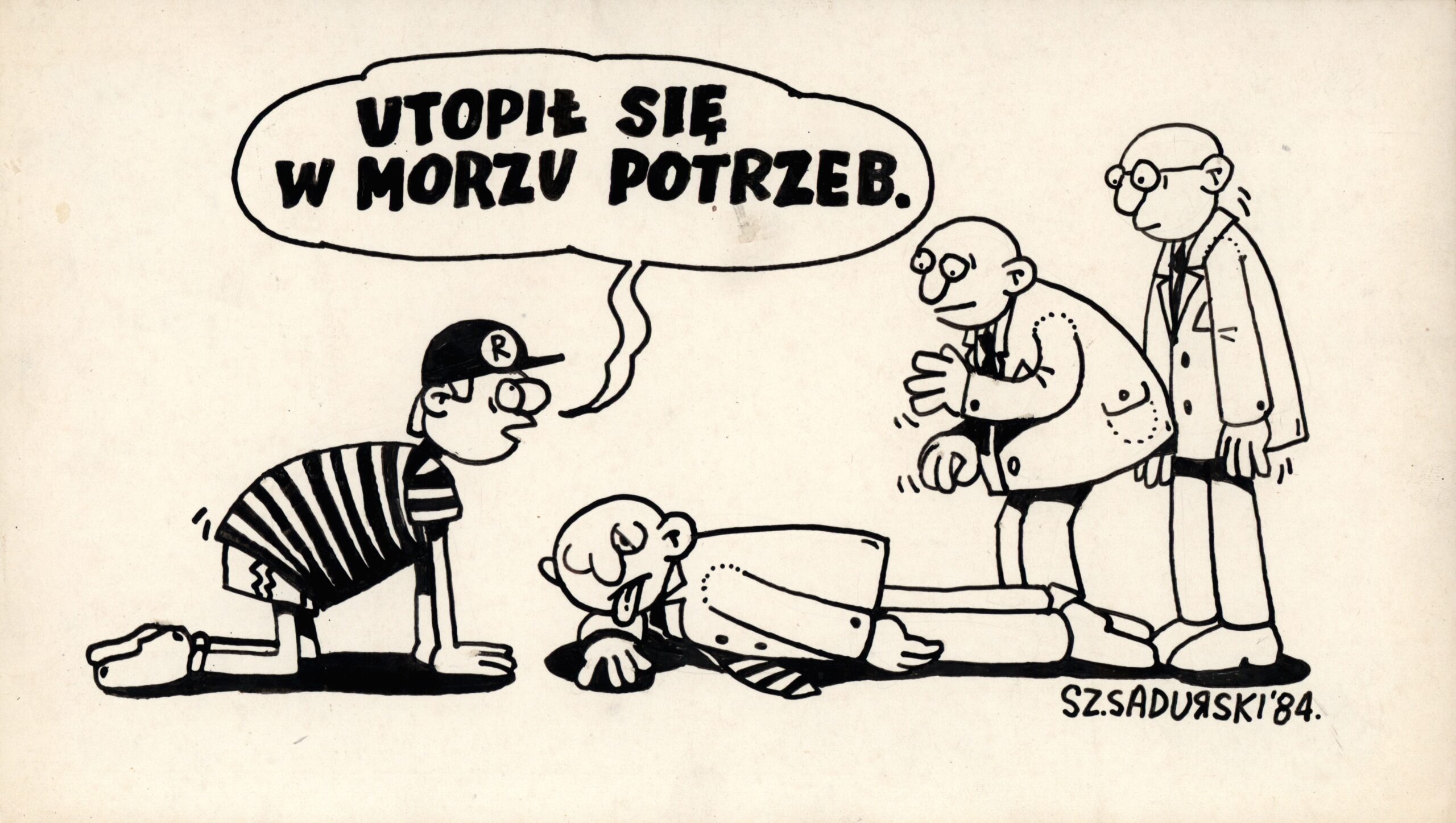Utopił się w morzu potrzeb, rysunek satyryczny