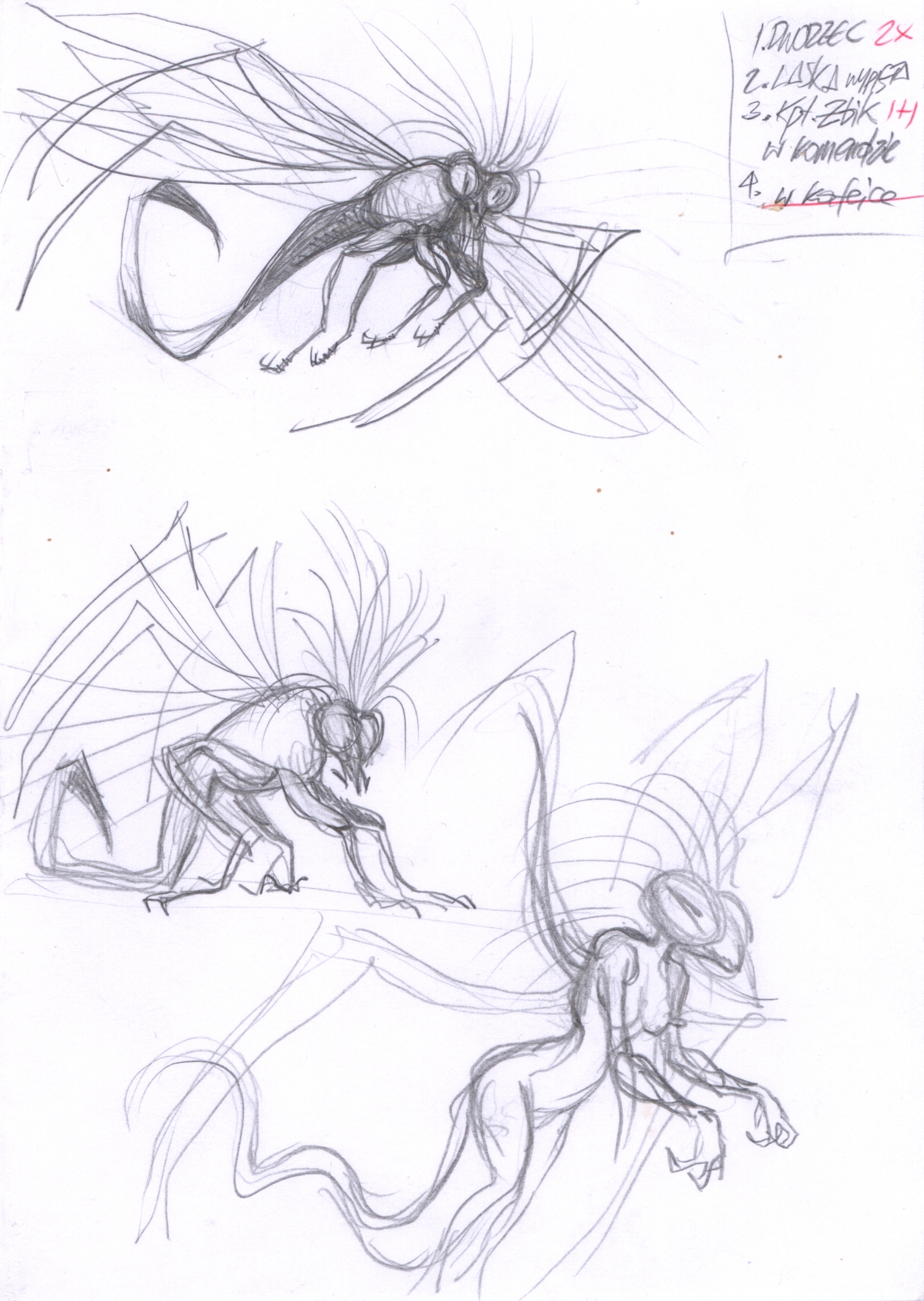 Szkic do nierozpoznanego projektu. Studium prawdopodobnie przepoczwarzającej się postaci latającego monstrum. Tytuł „Ważki” jest umowny.